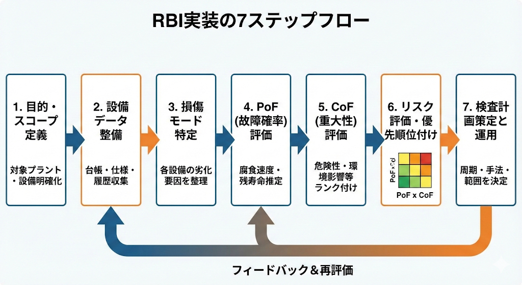 RBI(Risk Based Inspection)は、以下のような流れで進めると実務に落とし込みやすくなります。