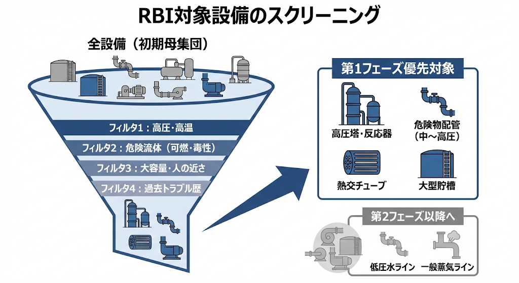 RBI導入の最初は、「全部やる」のではなく、優先すべき設備群を絞るのがポイントです。