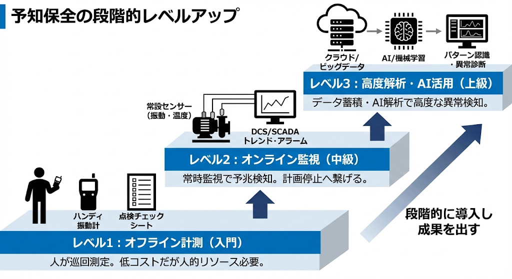 予知保全は、いきなり高価なシステムを入れず、段階的にレベルアップさせるのがおすすめです。