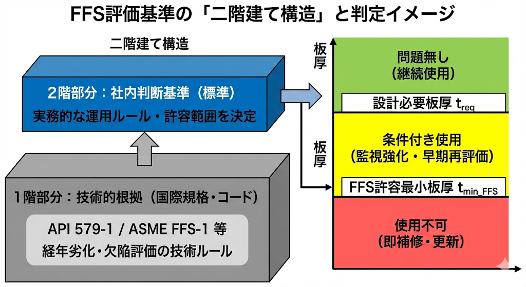 → 新設時に「この板厚なら設計条件に耐えられる」ことを保証するルール。 - FFS(Fitness for Service)