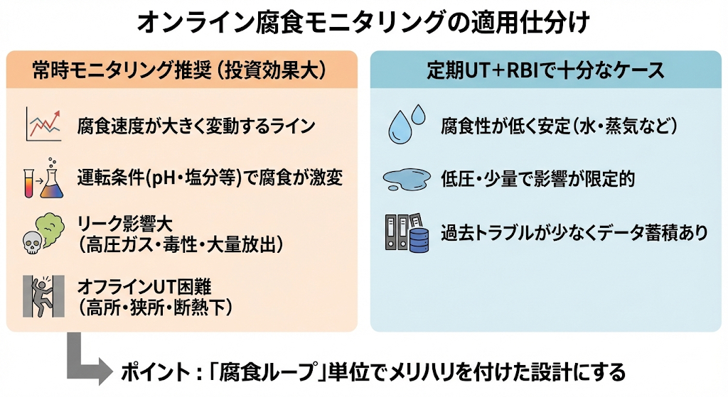 オンライン腐食モニタリング(腐食プローブ、オンラインUTなど)は、全ラインに入れる必要はありません。
