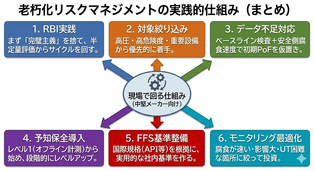 ここで整理した6つのテーマは、すべてRBI・予知保全・FFS・腐食モニタリングを、現場で“回る仕組み”に落とすための核心と言えます。
