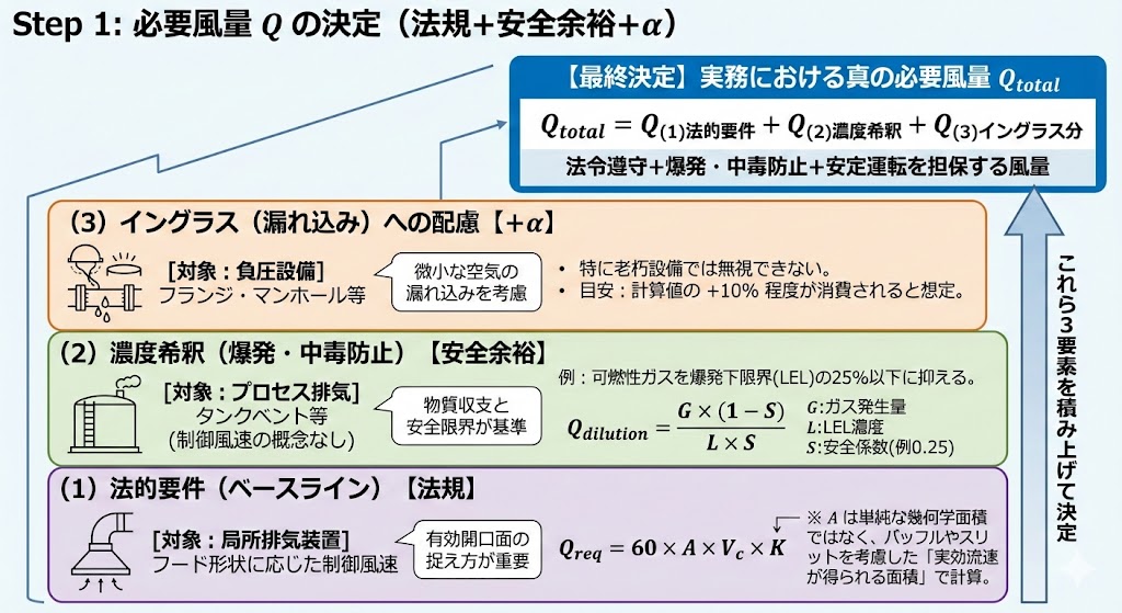 Step 1: 必要風量 $Q$ の決定(法規+安全余裕+α)