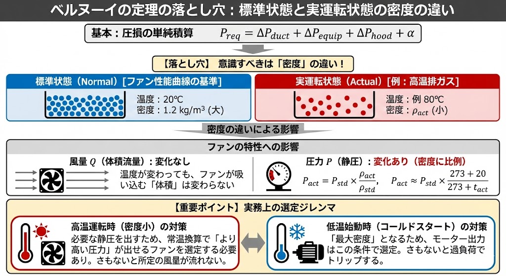 高温ガスを扱う場合、必要な静圧を出すためには、常温換算でより高い圧力が出せるファンを選定しておかなければ、所定の風量が流れません。逆に、モーター出力は「コールドスタート(冬場の朝一など)」の最大密度で選定しないと、過負荷でトリップします。