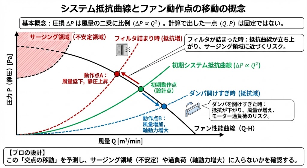 圧損 $\Delta P$ は固定値ではありません。風量の二乗に比例します($\Delta P \propto Q^2$)。計算で出した $(Q, P)$ はあくまで一点です。