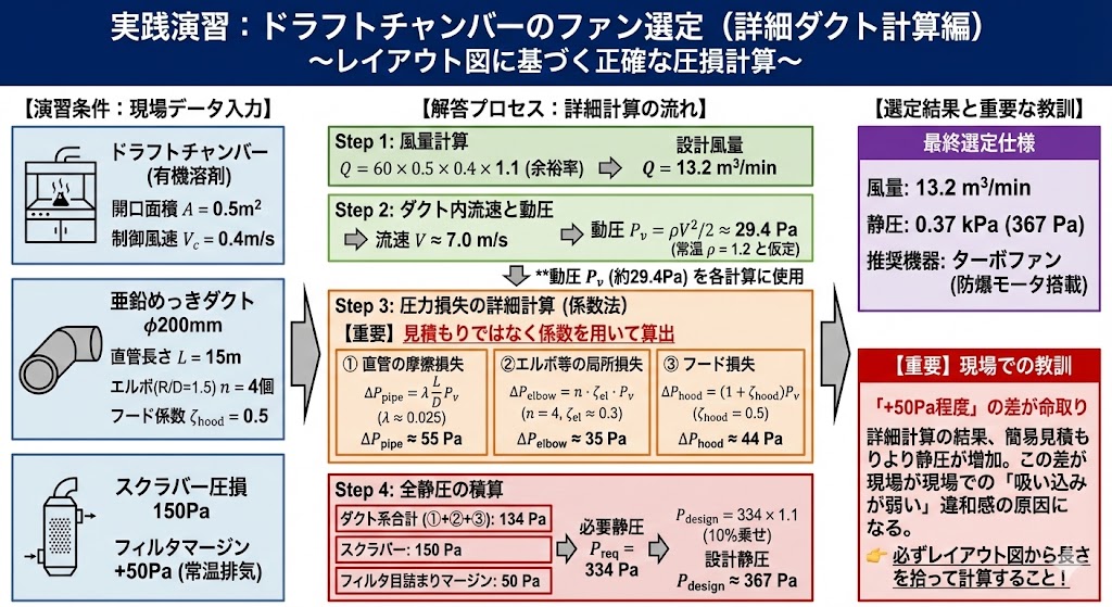 ダクト長さを考慮した結果、簡易計算よりも圧損が増加している可能性があります。 この差が、現場での「吸い込みが弱い」トラブルにつながります。必ずレイアウト図から長さを拾って計算しましょう。
