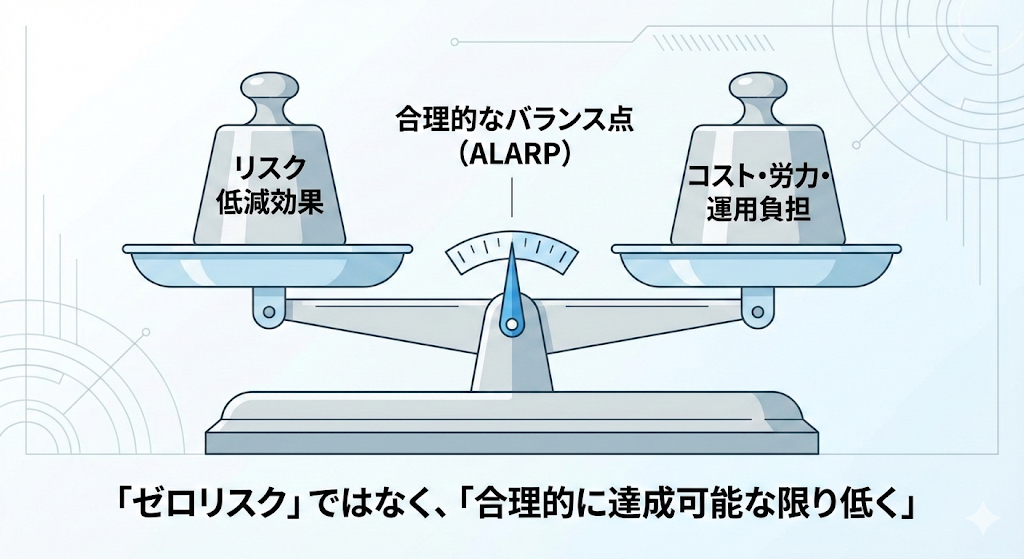 ALARP を主張するには、単に「コストがかかりすぎるのでやめた」では不十分で、一定のロジックと記録が必要です。