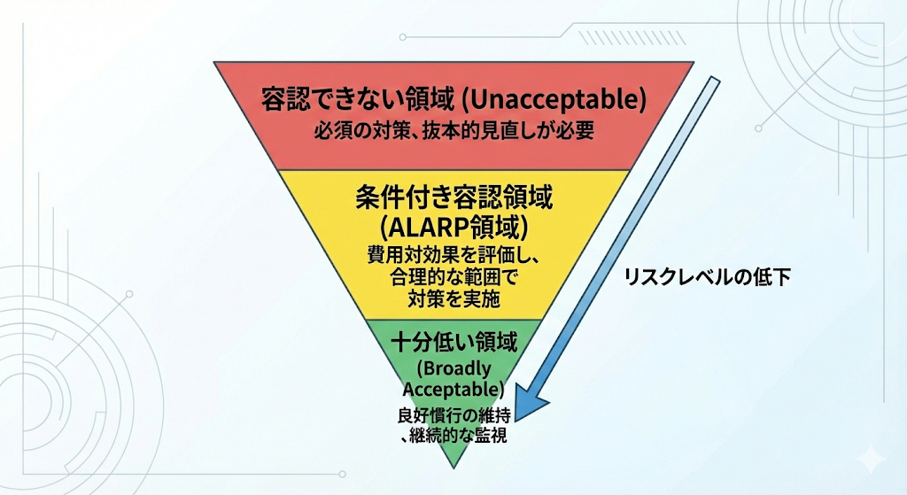 このとき、ALARP の考え方を使うと「どの程度まで追加対策を積み増すべきか」「どこまでやれば『合理的にやり尽くした』と言えるか」を整理しやすくなります。