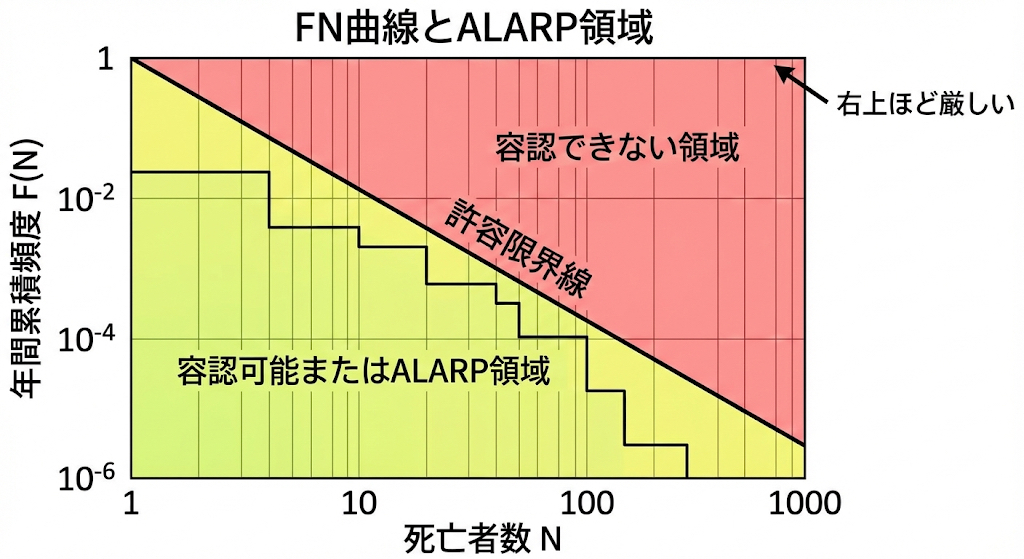 この FN 曲線と ALARP の組み合わせにより、「頻度」と「被害規模」の両面から、リスクがどの領域にあるのかを視覚的に確認できます。