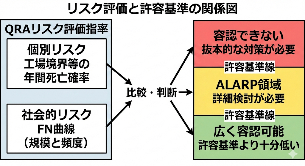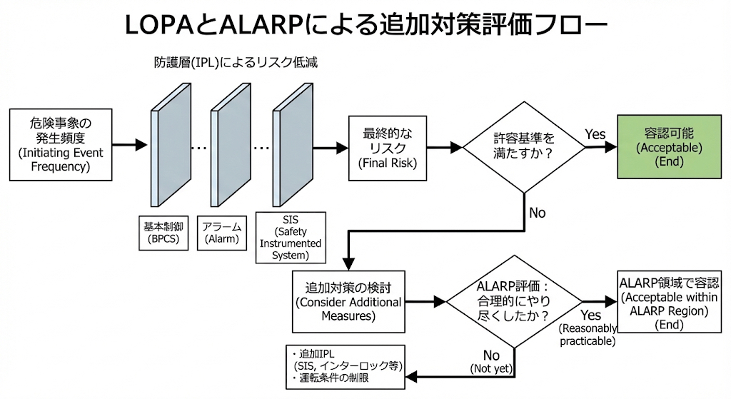 QRA や LOPA の結果をもとに、追加対策の必要性と妥当性を検討する枠組みとして ALARP を活用できます。
