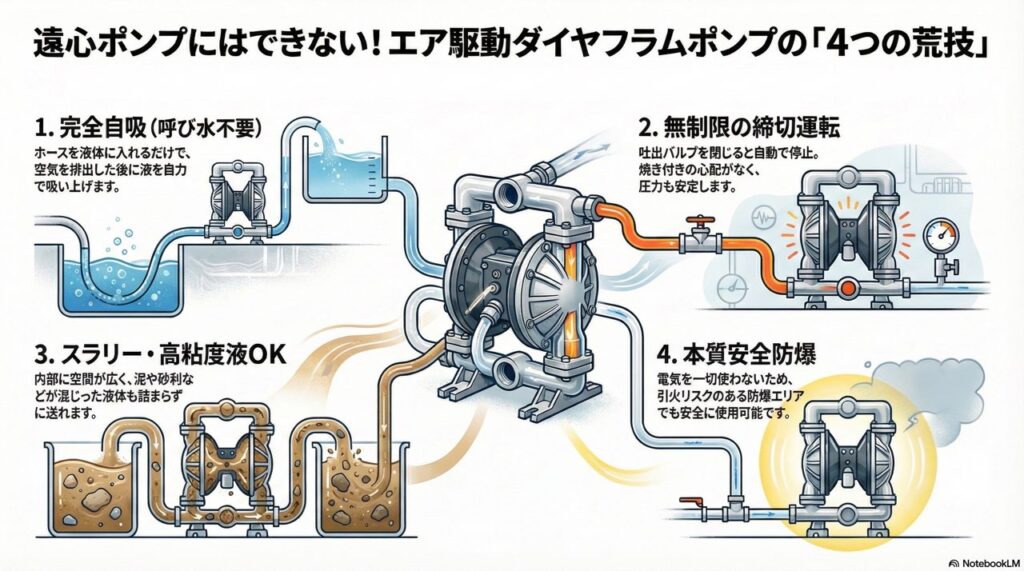 エア駆動ダイヤフラムポンプは、構造こそ単純ですが、遠心ポンプにはない「自吸・締切・防爆」という強力な武器を持っています。