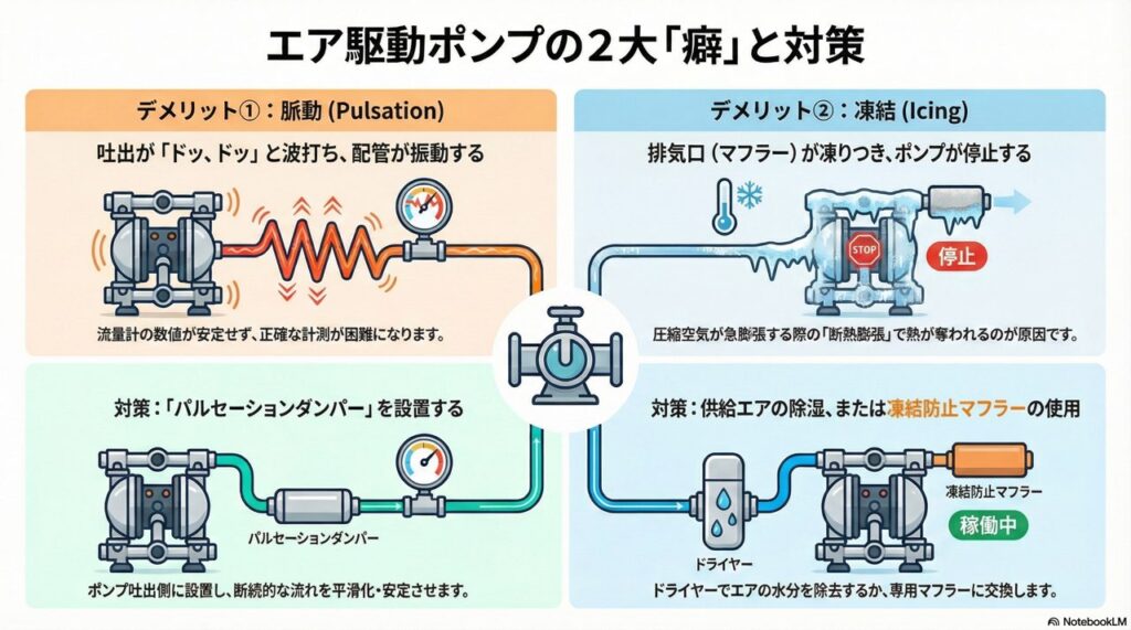 - 対策: 吐出側に「パルセーションダンパー(脈動減衰器)」を設置して圧力を平滑化します。