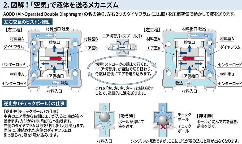 - 右工程: 中央のエア室から右側にエアが入ると、軸が右へ動きます。右側のダイヤフラムは液を「押し出し(吐出)」ます。