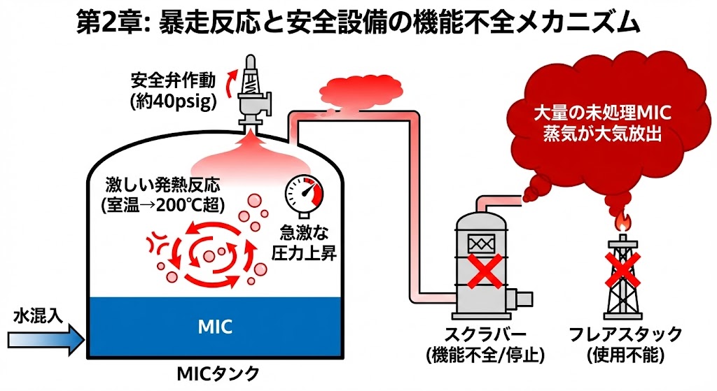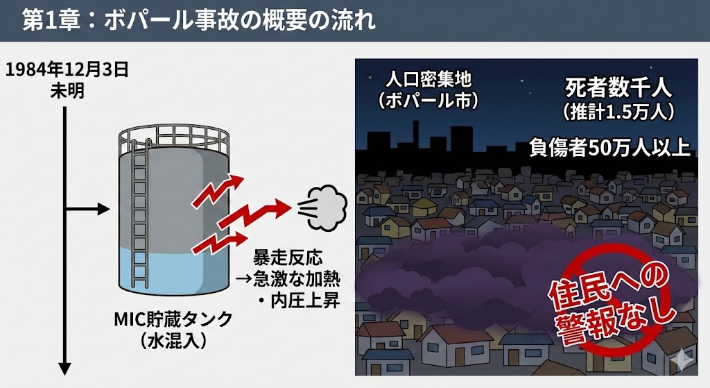 1984 年 12 月 3 日未明、ユニオンカーバイド社(UCC)ボパール工場の MIC 貯蔵タンクに水が混入し、暴走反応 → 急激な加熱 → 内圧上昇 → 毒性ガスの大気放出 が起こりました。