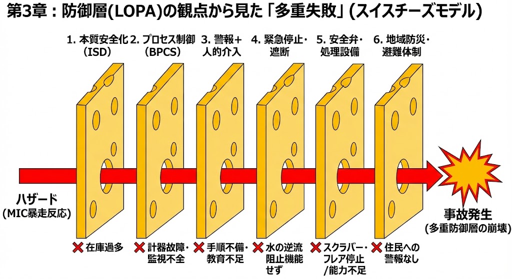 ボパール事故は典型的な “多重防御層の崩壊(defense-in-depth failure)” であり、各防御層(IPL)がほぼすべて機能していませんでした。