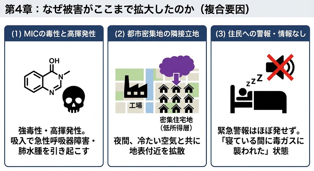 企業・行政からの緊急警報はほぼ発せられず、多くの住民は 「寝ている間に毒ガスに襲われた」 状態でした。