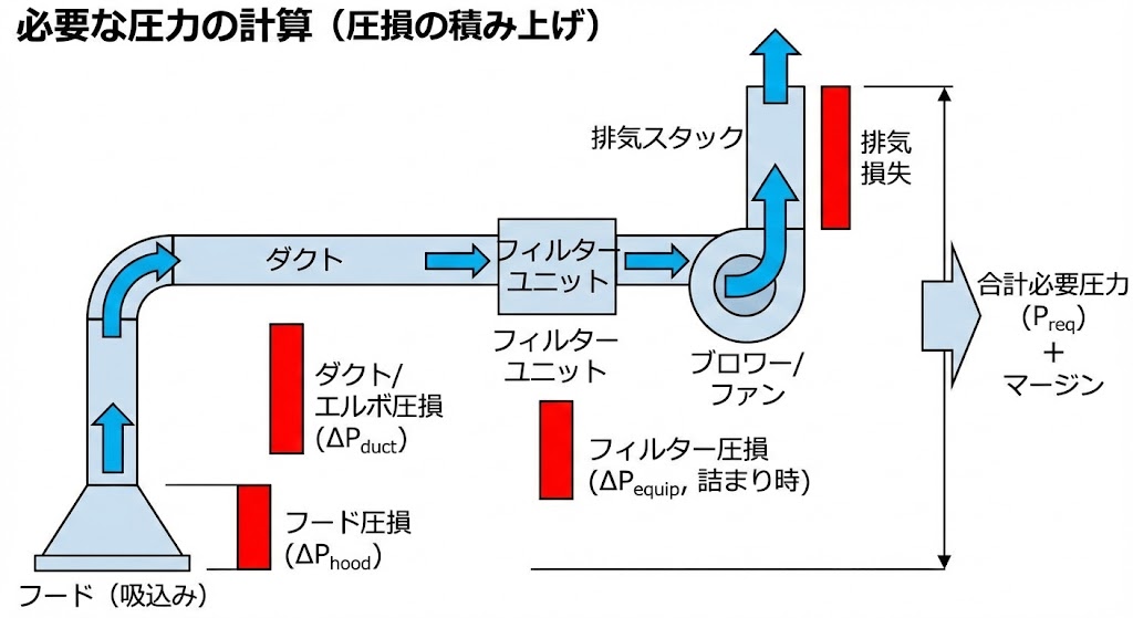 • $\Delta P_{equip}$(機器圧損): フィルター、スクラバー、熱交換器の抵抗(メーカー値参照)。