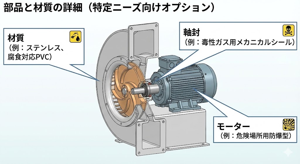 通常はSS400(鉄)やFC200(鋳鉄)。酸性ガスならPVC(塩ビ)やFRP、SUS304/316を選定。