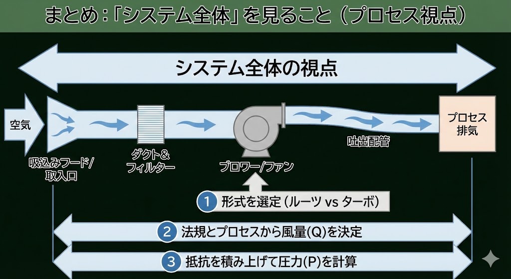 ブロワー単体を見るのではなく、吸込みから吐出までの「空気の通り道全体(プロセス)」をイメージすることが重要です。