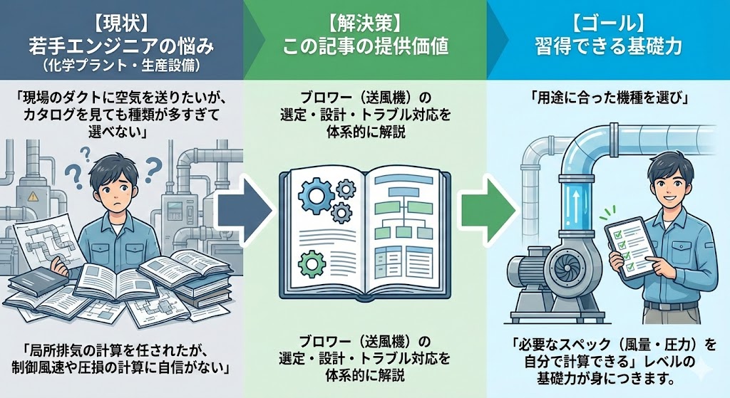 そんな悩みを持つ若手エンジニアに向け、化学プラントや生産設備におけるブロワー(送風機)の選定・設計・トラブル対応を体系的に解説します。