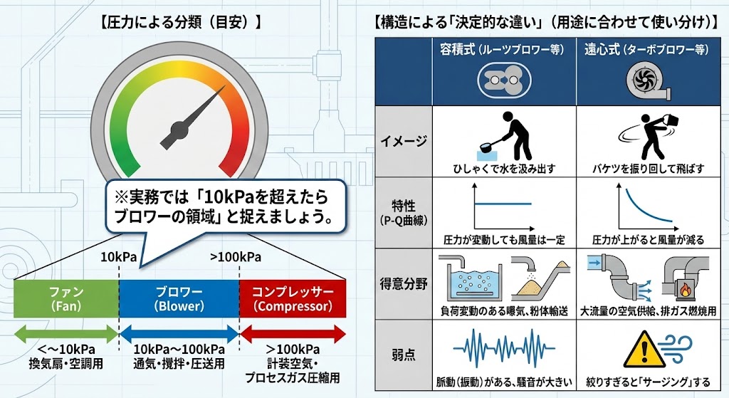 ※境界線はJISやメーカー定義により曖昧ですが、実務では「10kPaを超えたらブロワーの領域」と捉えましょう。