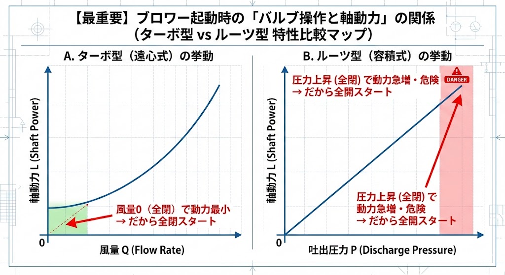 ブロワーの形式によって、起動時の負荷特性は真逆になります。誤った操作はモーターの焼損や保護装置の作動を招きます。