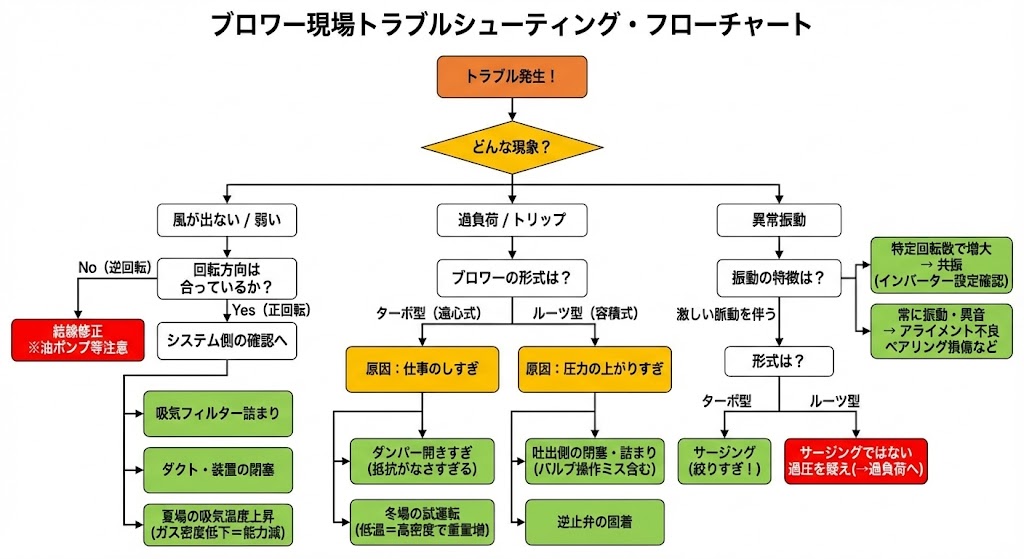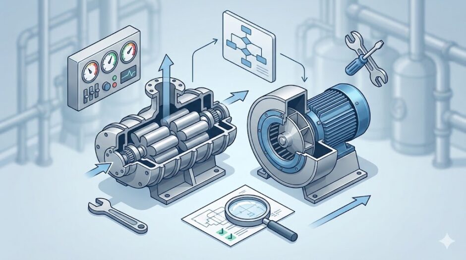 ブロワーやファンのトラブルは、単なる機械的な不具合だけでなく、プロセス条件の変化(温度、圧力、抵抗)と密接に関係しています。本記事では、教科書的な操作手順の背後にある工学的根拠と、特に混同しやすい「ターボ型(遠心式)」と「ルーツ型(容積式)」の挙動の違いに重点を置き、現象からの原因特定手順を解説します。