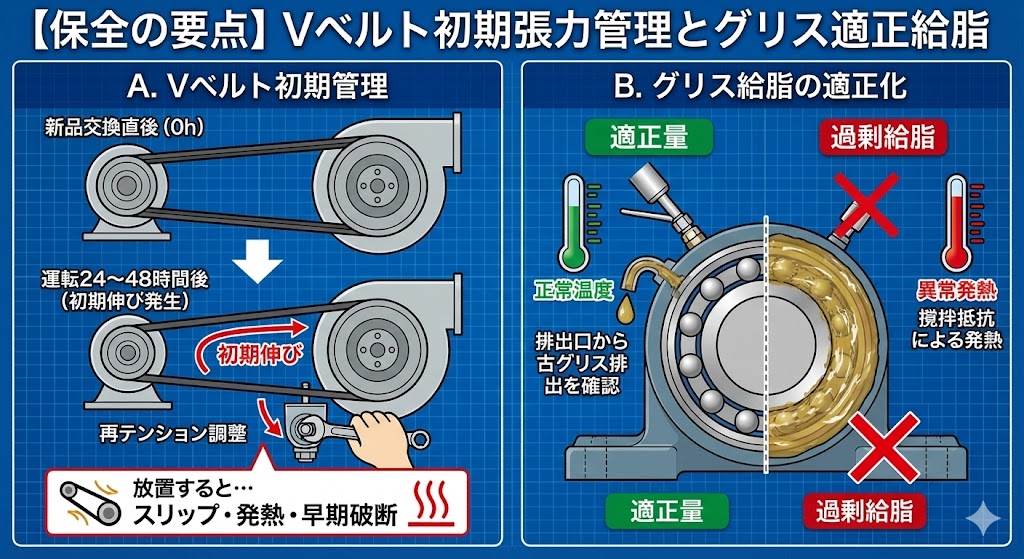 - Vベルトの初期管理: 新品交換後は必ず「初期伸び」が発生します。運転開始24〜48時間後に再度テンション調整を行うことで、スリップによる発熱や早期破断を防止できます。