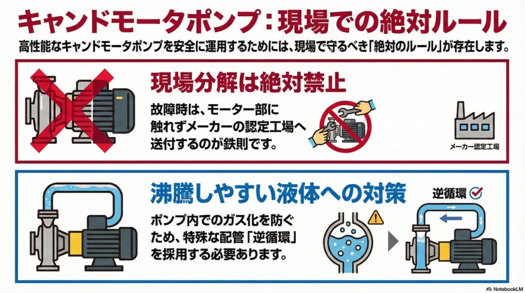 キャンドモータは、工場で精密に溶接・封入されており、現場で再組立することは不可能です。現場で開けていいのはポンプヘッド(羽根車)まで。モーター部には決して触れず、故障時はメーカーの認定工場へ送るのが鉄則です。