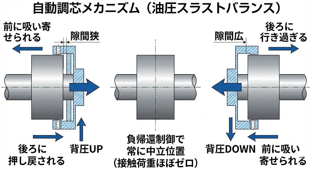 - ローターが後ろに行き過ぎる → 隙間が広がる → 背圧が下がる → 前に吸い寄せられる