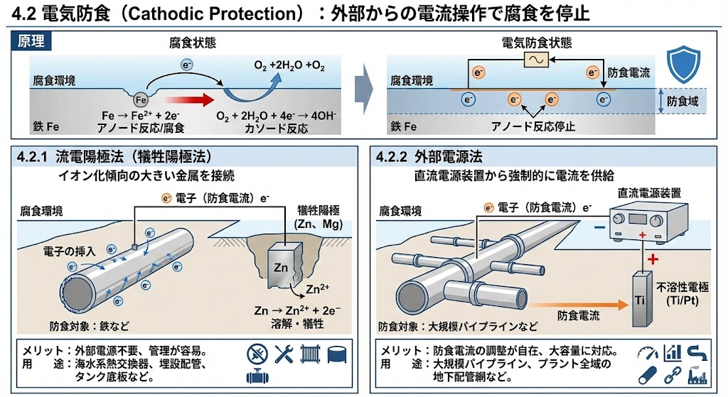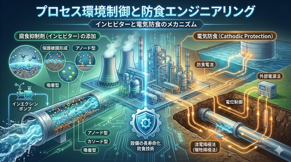 腐食対策は、適切な材料を選定するだけでは完結しません 。腐食の原因となるプロセス環境そのものを電気化学的・化学的に制御することで、設備の長寿命化を図る「防食技術」の適用が不可欠です 。