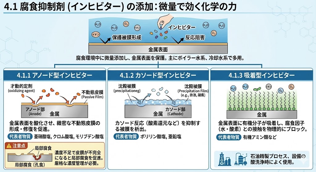 - 注意点: 極めて効果が高い一方で、添加濃度が不足すると、皮膜の不完全な部分に腐食が集中し、局部腐食(孔食)をかえって促進するリスクがあるため、厳格な濃度管理が求められます 。