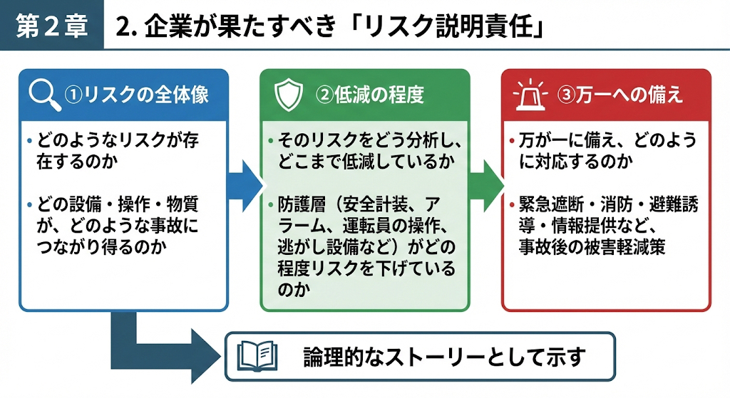 この「①リスクの全体像 → ②低減の程度 → ③万一への備え」を論理的なストーリーとして示すことが、リスク説明責任の中核です。