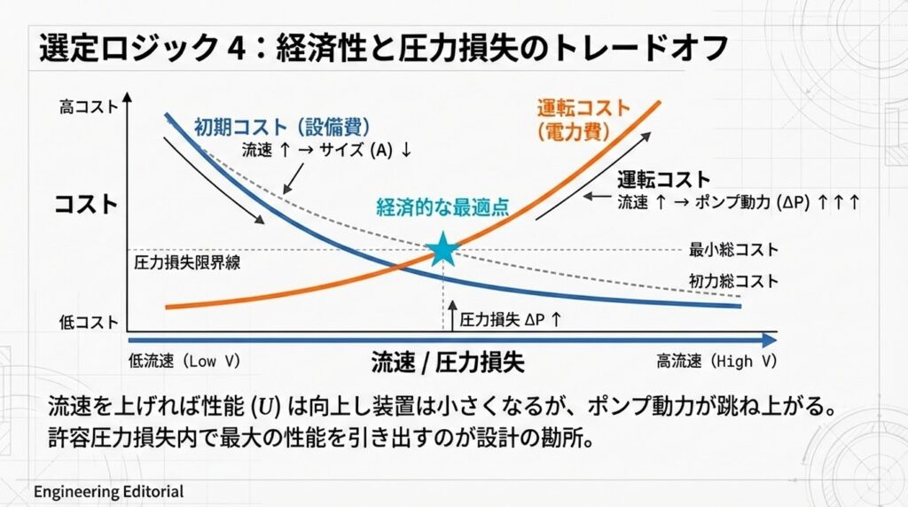 伝熱性能(U)を上げる鍵は「乱流」です。流速を上げて乱流を強くすれば装置は小さくなり、初期コスト(CAPEX)は下がります。しかし、圧力損失が増大し、ポンプを動かす電気代(OPEX)は跳ね上がります。この合計が最小になるポイントを見極めるのが設計者の腕の見せ所です。