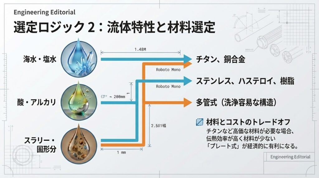 海水や酸性流体を扱う場合、チタンやハステロイといった高価な材料が必要です。この場合、材料そのものが高いため、少ない材料で高い効率を出せる「プレート式」の方が、装置全体として安くなるケースが多くあります。 一方で、固形分(スラリー)を含む場合は、詰まりにくく洗浄しやすい「多管式」を選ばざるを得ないこともあります。