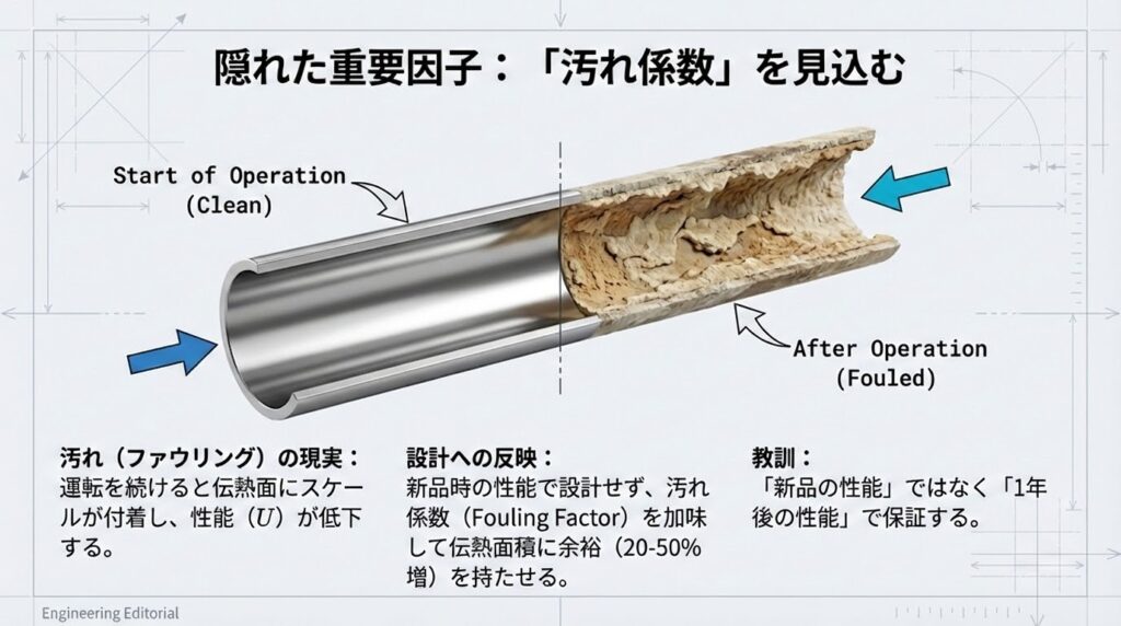 運転を開始すれば必ず汚れが付着し、性能は低下します。新品時の性能で満足してはいけません。あらかじめ汚れ係数を考慮し、伝熱面積に20%〜50%程度の余裕を持たせることが鉄則です。「新品時ではなく、1年後の性能でプロセスを保証する」のがプロの仕事です。