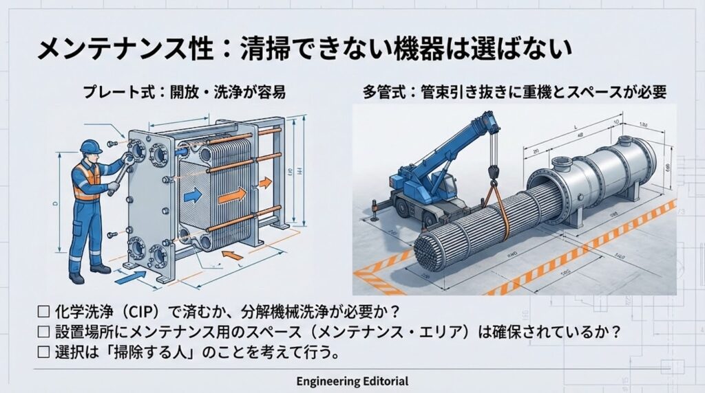 現場にそのスペースはあるのか? 化学洗浄で済むのか、機械清掃が必要なのか? これらを考慮せずに形式を選んではいけません。