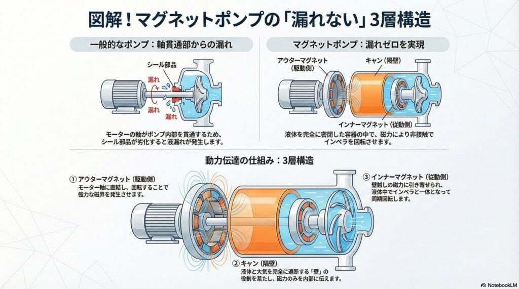 通常のポンプには、モーターの動力をインペラーに伝えるための「軸(シャフト)」が貫通しており、そこからの漏れを防ぐためにメカニカルシールが必要でした。しかし、マグネットポンプには貫通する軸がありません。だから、構造上「絶対に漏れない」のです。