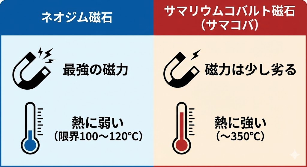 - ネオジム磁石: 最強の磁力でコンパクトですが、熱に弱い(限界100〜120℃)のが弱点です。