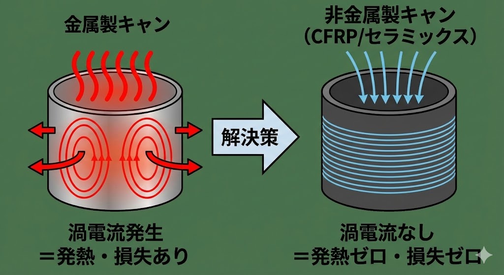 最近では、電気を通さないCFRP(炭素繊維強化樹脂)やセラミックス製のキャンが増えています。これらは渦電流が発生しないため、発熱ゼロ・損失ゼロの理想的な運転が可能です。