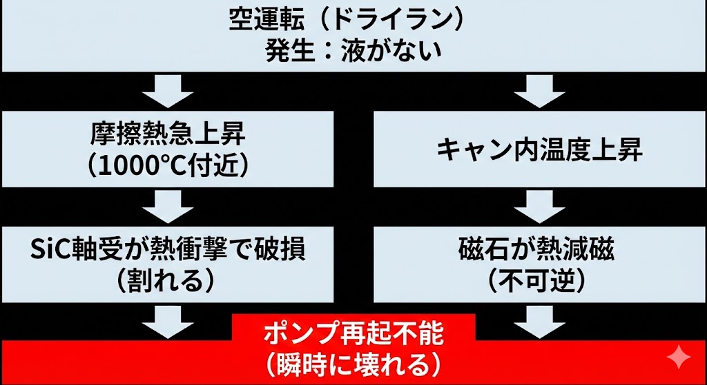 メカニカルシールポンプなら数分耐えられることもありますが、マグネットポンプは「数秒〜1分」で再起不能になります。その理由は2つあります。