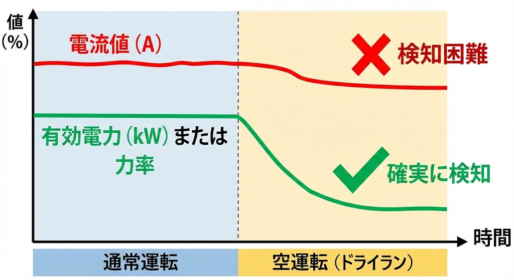 空運転を確実に見抜くには、「有効電力 ($kW$)」または「力率」を監視する必要があります。