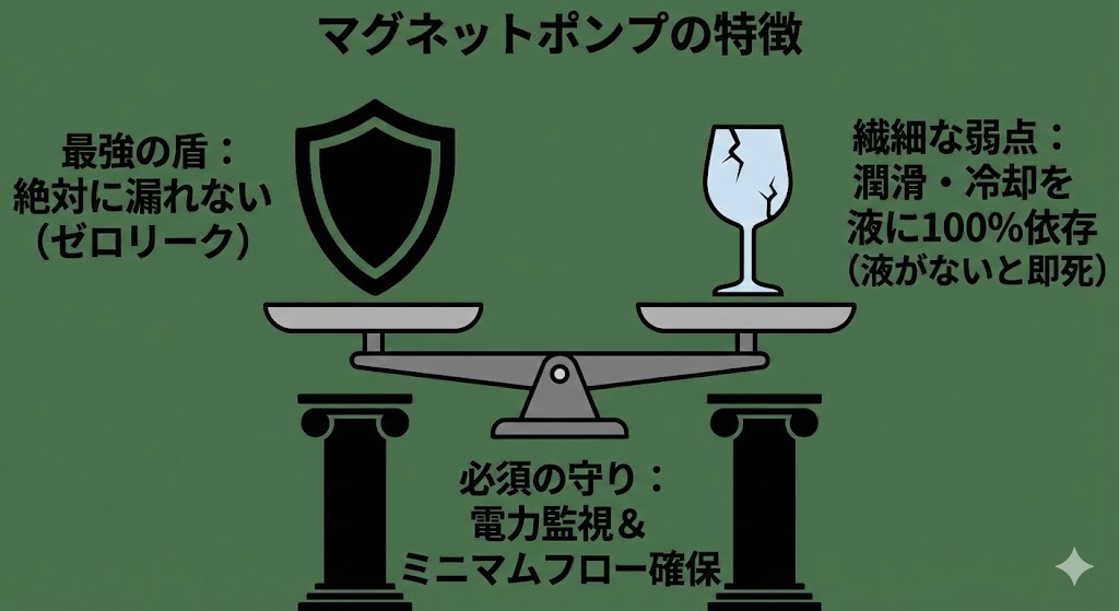 マグネットポンプは、「漏れゼロ」という最強の盾を持っていますが、その代償として「潤滑」と「冷却」をプロセス液に100%依存しています。