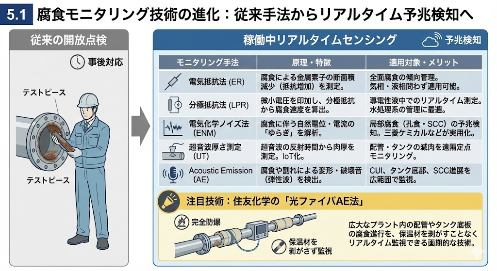 - 「見えない腐食」の可視化: 電気化学ノイズ法や光ファイバAE法などの活用により、従来困難だった局部腐食やCUIの稼働中モニタリングが可能になっています 。