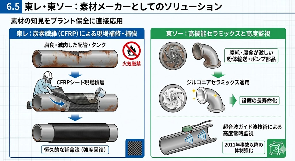 - 東ソー(高機能セラミックス): 極めて高い耐食性を持つジルコニアセラミックスを、摩耗や腐食が激しい粉体輸送配管やポンプ部品に適用し、設備の長寿命化を実現しています 。また、2011年の事故以降、超音波ガイド波技術などの高度な常時監視体制を強化しています 。