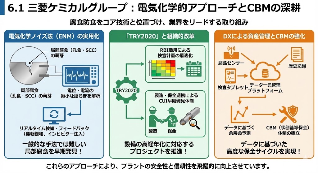 - 「TRY2020」と組織的改革: 設備の高経年化に対応するプロジェクトを通じ、RBIを活用した検査計画の最適化や、製造・保全が連携したCUI(保温材下腐食)の早期発見体制を構築しています 。