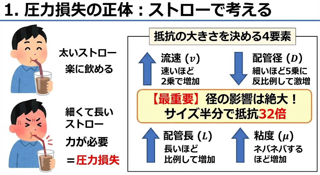 特に「配管径 ($D$)」の影響は絶大です。サイズを半分にすると、抵抗は2倍どころか32倍になります。だからこそ、サイズ選定は慎重に行う必要があるのです。