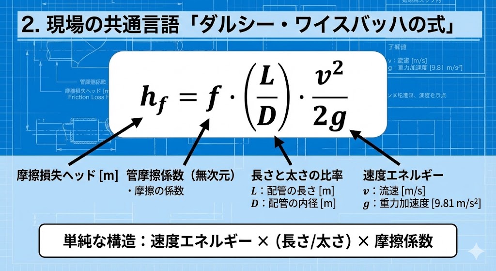 「速度エネルギー($v^2/2g$)に、長さと太さの比率($L/D$)と、摩擦の係数($f$)を掛け算する」だけです。
