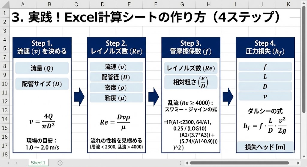 本来は「コールブルックの式」を使いますが、Excelでは循環参照になるため、高精度な近似式である「スワミー・ジャイン(Swamee-Jain)の式」を使います。