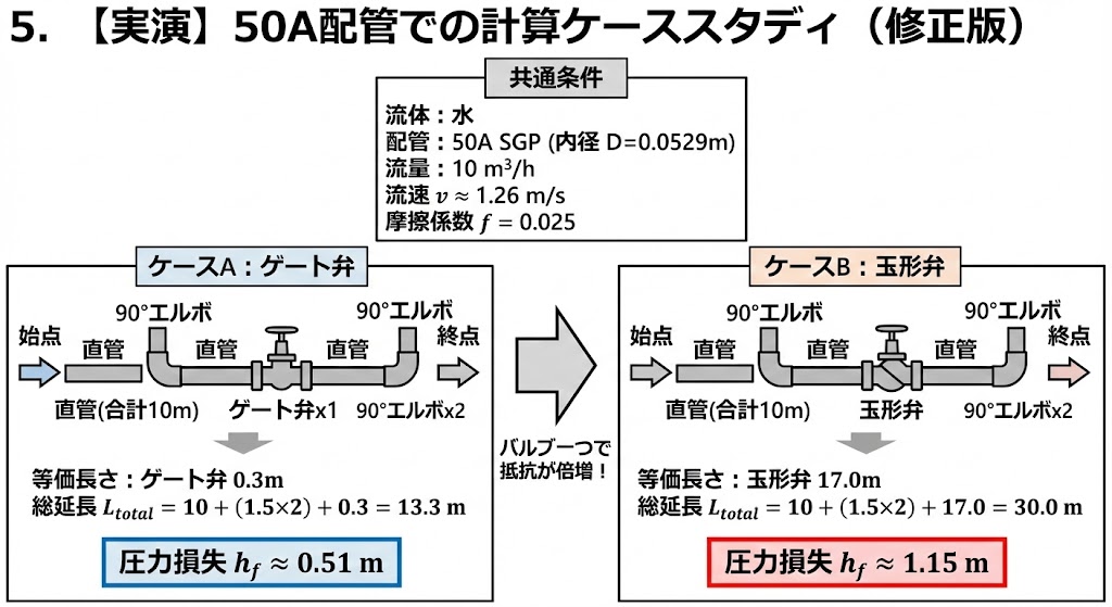 直管の長さは同じ10mなのに、バルブの種類を変えるだけで、圧力損失は0.51mから1.15mへと倍増しました。